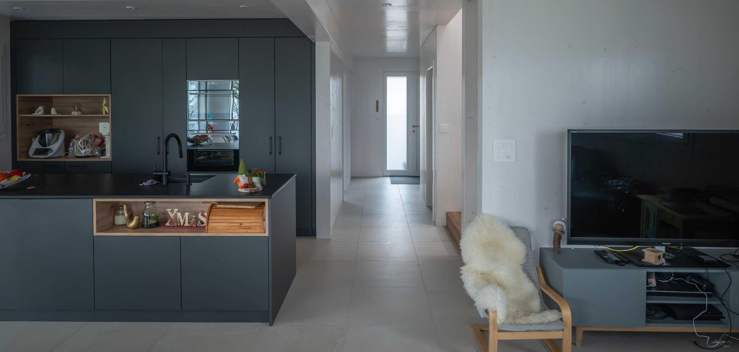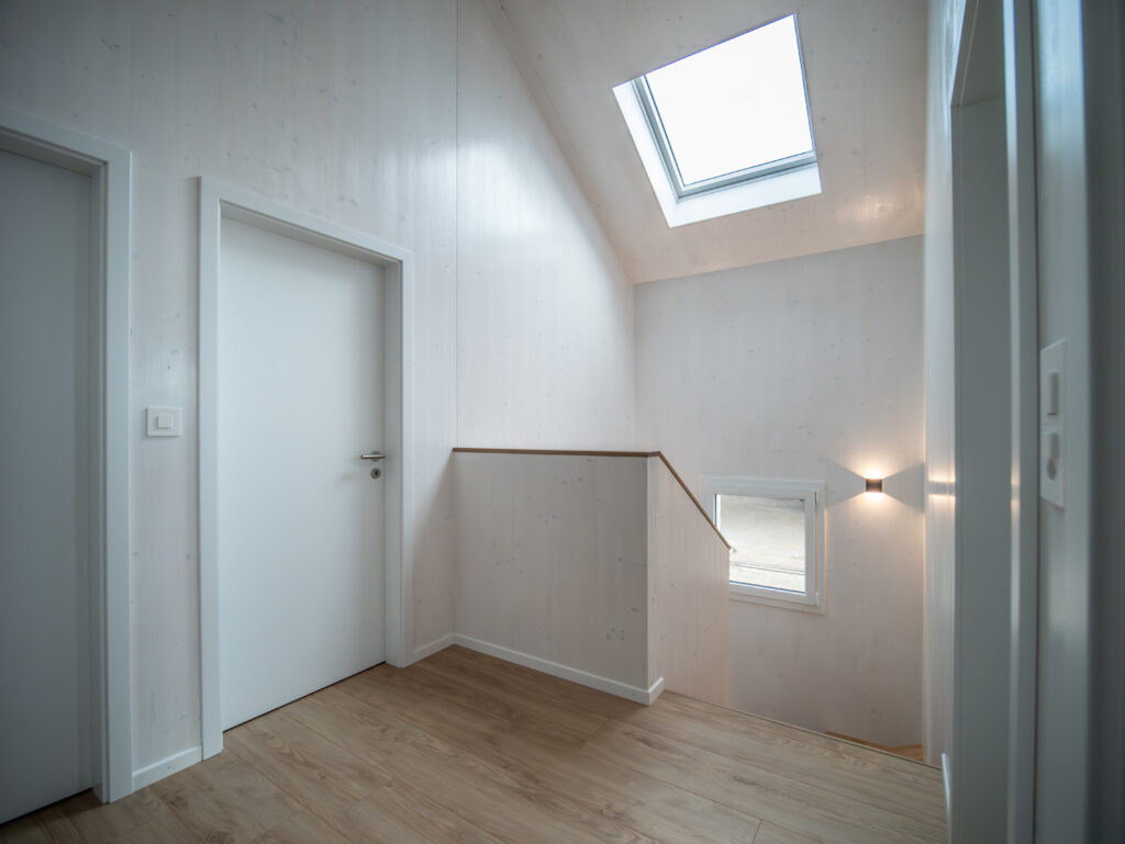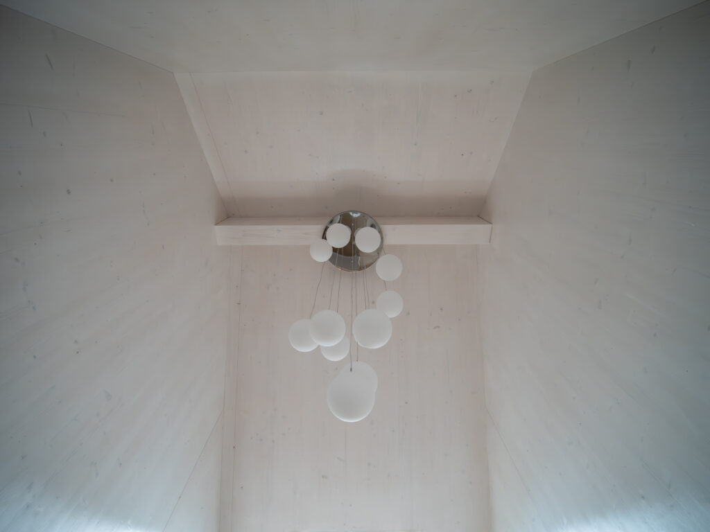 L’utilisation du CLT pour les murs, les dalles et la toiture, a permis de conserver le bois visible, un choix audacieux qui a été parfaitement intégré dès la pose de la structure avec la grue de chantier. L’usinage des passages électriques a été planifié grâce à notre logiciel de modélisation Cadwork 3D.