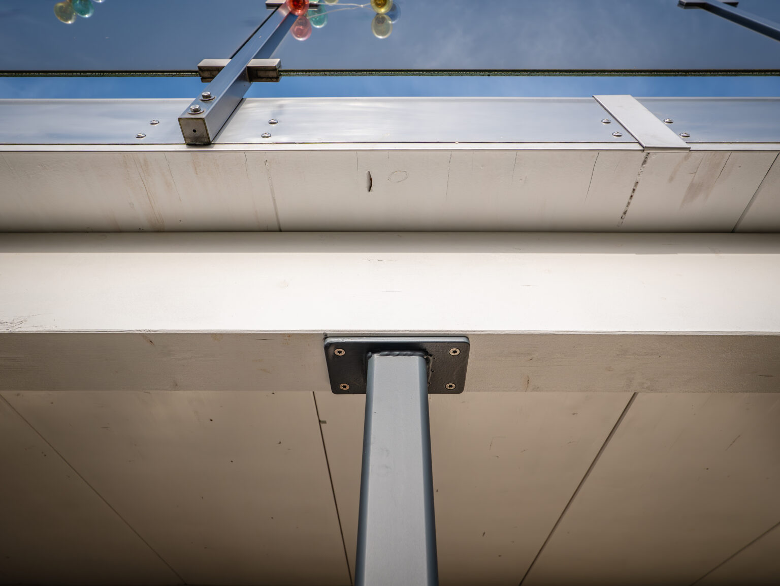 Après expertise, nous avons mis en place un renforcement avec une poutre en lamellé-collé reposant sur deux poteaux métalliques en acier thermolaqué, fournis par un partenaire.